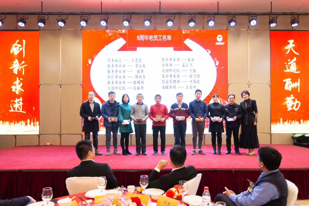 在接下来的颁奖典礼环节,为过去的一年在工作岗位上的贡献突出员工颁发了多个奖项,分别是:年度优秀员工、最佳新人、创新奖、工匠奖、服务奖、销售精英奖,团队建设奖和优秀俱乐部等。以及为公司5周年、10周年、15周年的老员工授予忠诚勋章。对他们的努力和奉献给予充分的肯定以及荣誉。