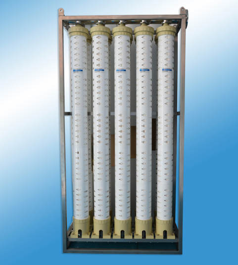 高纯水浸没式超滤膜系统中设有曝气、反洗及自控装置,可实现气洗和水洗的自动控制,膜池进水为原水或沉淀池出水,出水方式为泵抽吸,通过设置在浸没式超滤膜组件出水管上的真空压力表检测跨膜压力。